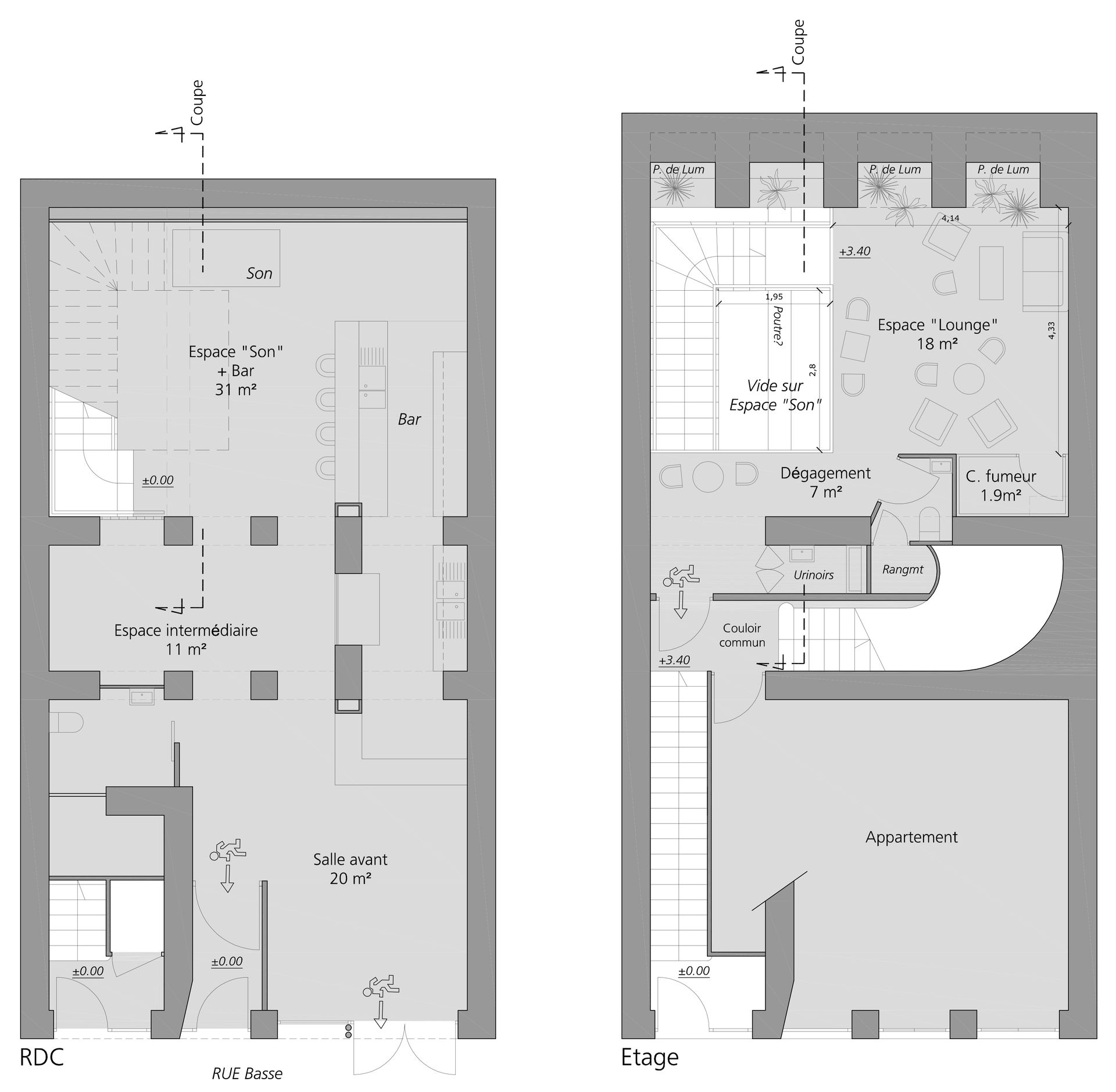 Extension d'un "bar/lieu culturel" par l'aménagement d'un appartement aveugle situé au dessus